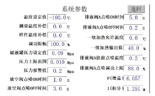 溫度設(shè)定值:設(shè)置低溫汽化器出口目標(biāo)溫度值;測(cè)量溫度補(bǔ)償:設(shè)置低溫汽化器出口溫度傳感器校正值:樣件溫度補(bǔ)償:設(shè)置樣件溫度傳感器校正值;調(diào)功限幅:設(shè)置低溫汽化器二級(jí)加熱大輸出功率;儲(chǔ)液罐壓力設(shè)定值:設(shè)置儲(chǔ)液罐內(nèi)目標(biāo)壓力值;壓力上限范圍值:設(shè)置儲(chǔ)液罐內(nèi)目標(biāo)壓力范圍值:壓力報(bào)警值:設(shè)置儲(chǔ)液罐內(nèi)目標(biāo)壓力上限報(bào)警值;放空閥點(diǎn)噴 ON 時(shí)間:設(shè)置控制儲(chǔ)液罐壓力時(shí)放空閥開(kāi)啟時(shí)長(zhǎng);放空閥點(diǎn)噴 0FF 時(shí)間:設(shè)置控制儲(chǔ)液罐壓力時(shí)放空閥關(guān)閉時(shí)長(zhǎng);排液閥A點(diǎn)噴ON時(shí)間:設(shè)置排液閥A進(jìn)入點(diǎn)動(dòng)狀態(tài)開(kāi)啟時(shí)長(zhǎng):