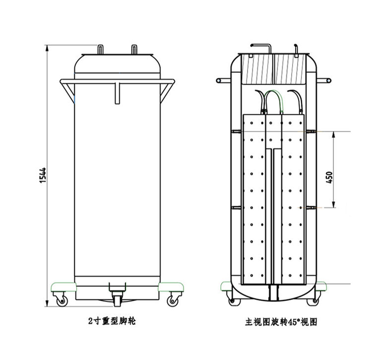 容器內已經添加了支撐結構,以增強運輸耐性。容器采用高真空、多層絕熱結構的形式,真空層中設有吸附劑,能夠長期保持真空度。容器蓋由帽蓋和芯塞構成,芯塞采用絕緣性能優良的硬質發泡塑料制成,不僅可降低液氮蒸發量,還能固定提筒。為了減少液氮在容器工作狀態中的蒸發,提筒采用不銹鋼制造。提筒的提桿和桿筒組件之間采用玻璃纖維增強塑料細管連接,以提高絕緣性能。液氮罐上部安裝有定位環,提筒可通過定位環上的槽和內膽底部的凸起以及芯塞而固定,使得工作狀態更加穩定,安全地進行搬運和長途運輸。